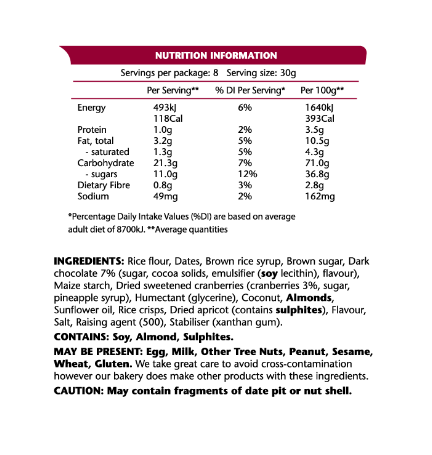 • Made with wholesome ingredients such as low-GI oats, dried cranberries and dark chocolate—providing sustained energy without relying on processed sugars.